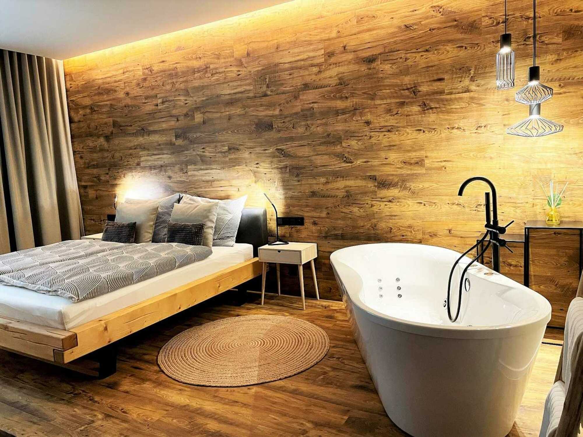 Přímo na pokoji na vás čeká vířivá vana, do které stačí přidat připravenou koupelovou sůl a příjemný relax v bublinkách může začít. Z vany je krásný výhled na značkovou televizi s Oled technologií a zvukem Bowers & Wilkins.