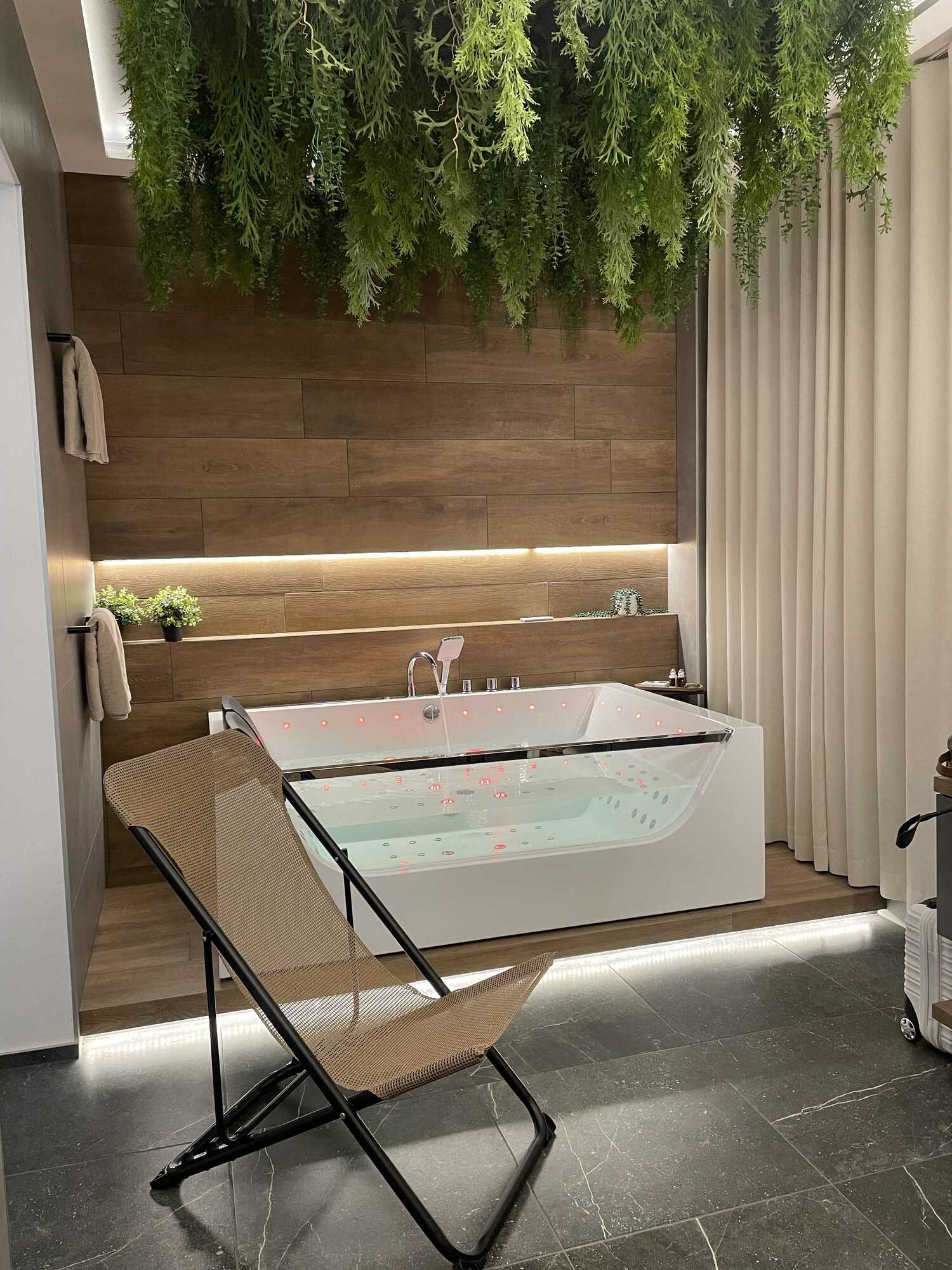 V pokoji na vás čeká prostorná vířivá vana pro 2 s podsvícením hladiny a s krásným pohledem do zeleného stropu.